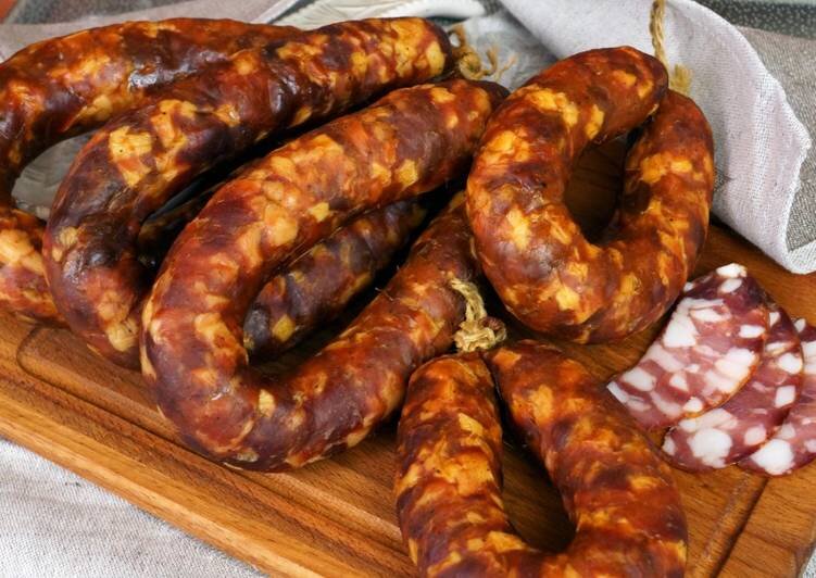 Смешивание говядины и свиного фарша без жира, добавить сахар, соль, смесь перцев,чеснок; Вымешивание до липкого состояния и появления белковых нитей, набивка колбас в череву, добавить грудинку, кубики холодного шпика и снова перемешать, температура при этом не должна превышать 12 гр.; Набивка батонов в череву и вывешивание на осадку и растоплени