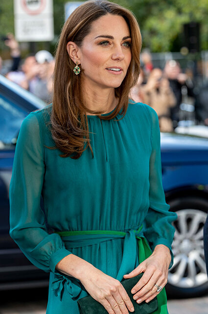 Если не брать во внимание этот момент, то платье от бренда ARoss Girl x Soler стоимостью 825 фунтов стерлингов все равно нельзя назвать красивым. Фасон скучный, бирюзовый цвет не идет Кэтрин, а зеленый пояс, завязанный на узел здесь "ни к селу ни к городу". Но мне очень понравились серьги Zeenwoman Dazzling Ceramic Drops за 6 долларов. Темно-зеленые туфли и клатч созданы Emmy London.