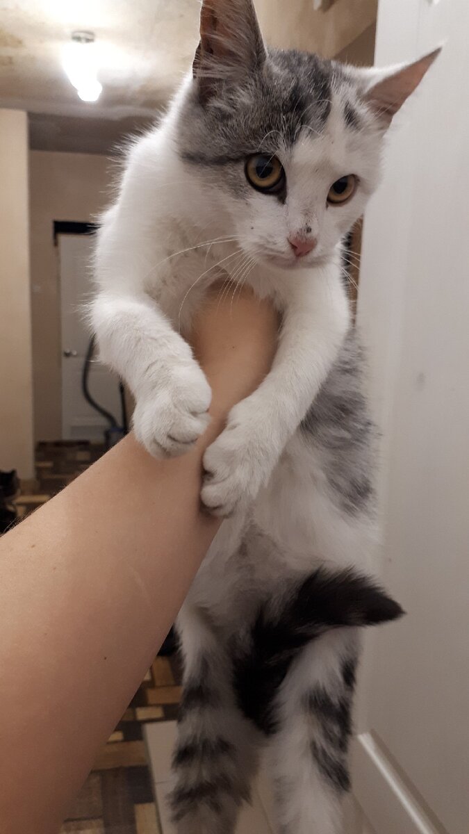 Вечером на улице начался дождь, и дети перенесли кошку в подъезд и позвонили нам с просьбой о помощи. Так она