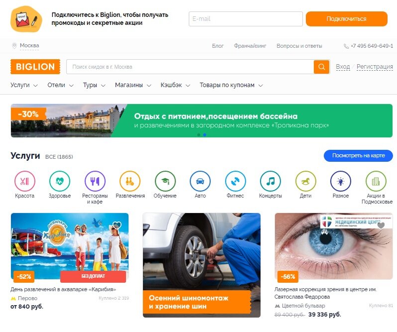 Вы когда-нибудь покупали товары или заказывали услуги на сайте «Биглион»? Это одна из крупнейших российских площадок по продаже купонов, где в онлайн-каталоге вы сможете без труда найти скидки на сотни самых разных товаров и услуг. Продуманная система навигации позволяет легко подбирать ваучеры, которые действительны в вашем городе, а регулярно обновляющийся список спецпредложений не даст вам упустить выгоду. Сайт очень удобен в использовании. Хотите сэкономить по максимуму? Для этого нужно лишь выбрать подходящий онлайн-купон, приобрести его и распечатать (или записать его номер). К оплате принимаются банковские карты и электронные деньги. Ипользуйте купоны и промокоды на скидку «Биглион» за октябрь 2019 года: АКТИВНЫЕ КУПОНЫ И ПРОМОКОДЫ BIGLION 👉 Только у нас! -10% на первую покупку купонов по промокоду от Biglion 👉 Эксклюзив! Скидка 5% на покупку любых купонов по промокоду 👉 Популярные товары по купонам со скидкой до 90% ПРОМОКОДЫ САЙТОВ, ПОХОЖИХ НА СЕРВИС BIGLION 📌 Д