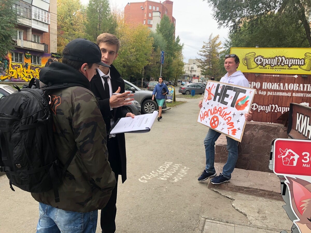 Одиночный пикет молодые люди устроили в поддержку поправки к закону «О государственном регулировании производства и оборота этилового спирта, алкогольной и спиртосодержащей продукции». Поправка заключается в том, чтобы запретить продавать алкоголь о