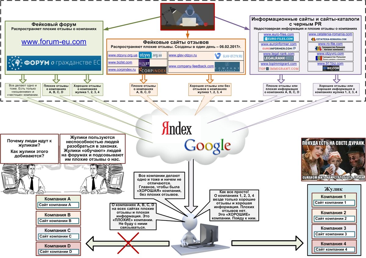 Ниже представлена схема работы фейкового форума, фейковых сайтов отзывов и сайтов с черным PR одного известного жулика. Свои услуги этот жулик предлагает под брендами 12-ти сайтов. По этическим причинам мы не указываем сайты этого жулика. Распознать сайты этого жулика легко по отсутствию плохих отзывов на фейковых форумах и фейковых сайтах отзывов. На этих фейковых сайтах могут находиться только хорошие отзывы о сайтах жулика. В последнее время этот жулик создал несколько информационных сайтов и сайтов-каталогов с черным PR. На этих сайтах также находится хорошая информация о сайтах жулика и плохая информация о других сайтах.