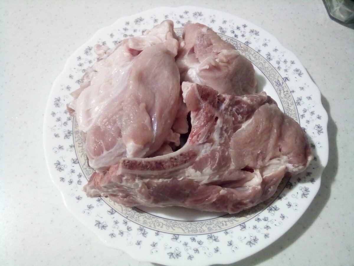 600-700 гр. мяса на кости(свинина ,говядина),лучше, если, это будет грудинка.