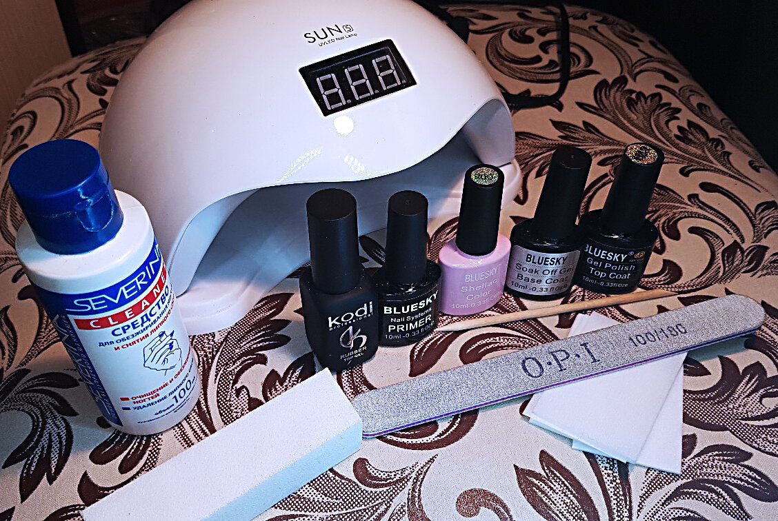 Большинство женщин отказались от использования классических лаков в пользу гель-лаков или шеллаков. Такой маникюр может держаться до 2-3 недель, сохраняя при этом презентабельный вид. Что же нужно новичку для того, чтобы создать такой маникюр? Вам понадобится Самые важные элементы в наборе - лампа и лаки (топ,база), на всем остальном можно сэкономить. От лаков и лампы во многом зависит насколько качественный получится маникюр. Лампу я покупала на сайте "Aliexpress" за 1000 рублей, называется "Sun 5". Можно, конечно, приобрести такие же или подобные в интернет-магазинах, просто цена будет выше, а качество тоже самое. Плюс этой лампы в том, что она имеет 36 светодиодов мощностью 48W с UV и LED излучением, за счёт чего любое покрытие высыхает в считанные секунды. Также лампа имеет датчик движения, когда вы кладёте в нее руку, она включается, вынимаете - выключается, не обязательно ждать ровно 10/20/30 секунд. Для новичка советую брать лампу именно такого типа, поверьте, вы сэкономите куч