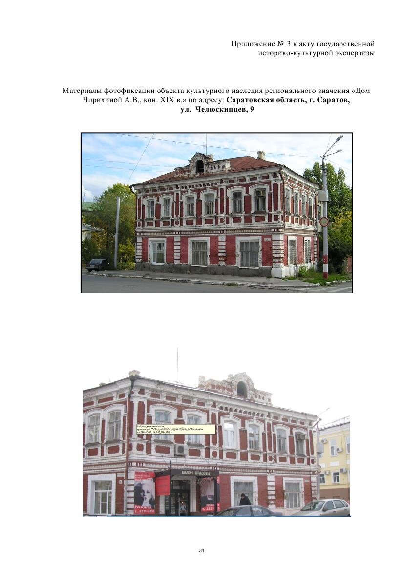 К середине 1880-х годов его приобрела известная саратовская купчиха и меценатка Анна Васильевна Чирихина. Она выстроила каменный двухэтажный дом, примыкавший к ранее существовавшему дому, обложенному кирпичом.