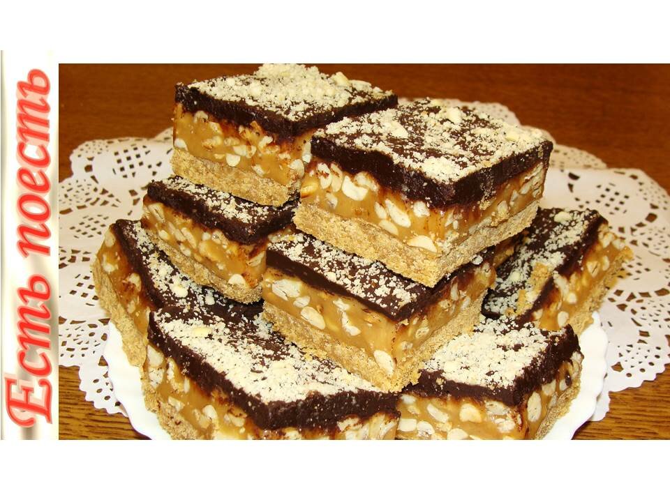 Очень вкусный десерт, напоминающий "Сникерс". Готовится просто, без лишних хлопот. Попробуйте, как Вам нравится больше, когда десерт холодный и карамель густая, вязкая. Или комнатной температуры - мягкая карамель. Ингредиенты: печенье - 300 г, масло слив. - 130 г, ирис молочный - 400 г, арахис - 200 г, шоколад - 180 г, молоко - 6 ст.л. Блендером измельчить в крошку печенье. Добавить 120 г. растопленного масла, 2 ст.л молока и перемешать. Выложить массу в форму (у меня 20 на 20 см), покрытую пергаментом. Плотно утрамбовать. К ирискам добавить 2 ст.л молока и растопить, помешивая, на водяной бане или в микроволновке. Добавить к карамели очищенный и поджаренный арахис, хорошо перемешать и выложить массу на слой из печенья, разровнять.