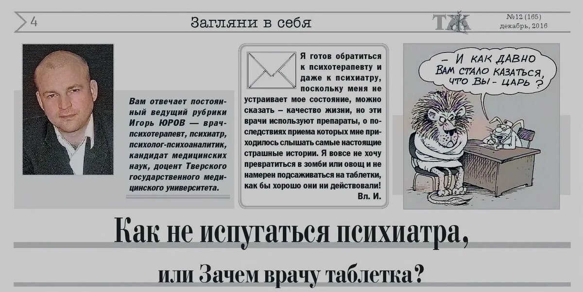 Еще раз прислушаемся к типичным сплетням. «После обращения к психиатру мой знакомый вынужден постоянно принимать антидепрессанты»; «в психоневрологическом диспансере родственника подсадили на транквилизаторы»; «в психиатрической больнице соседа закололи нейролептиками так, что его теперь не узнать»; «ни за что не буду принимать психотики, они отравят мой организм»; «мой друг обратился к врачу-психотерапевту в связи с бессонницей, и тот назначил ему наркотики, без которых он теперь не может жить». И правда, звучит страшно.
