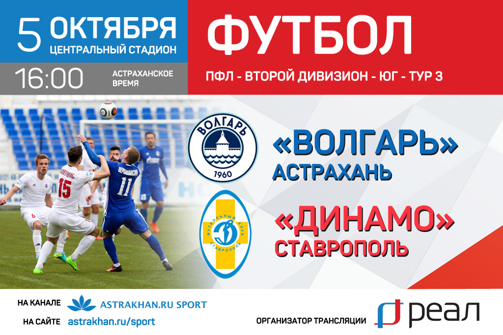 Уже завтра 5 октября в 16.00 наши футболисты в рамках 12 тура Олимп-Первенства ПФЛ в группе «Юг» примут на своём поле команду «Динамо» из Ставрополя. На данный момент «Динамо» находится на пятой строчке турнирной таблицы с 20‑ю очками. «Волгарь» подходит к этому матчу в ранге фаворита – его позиция в таблице первая. Астраханская команда выдала впечатляющую серию из 5 побед подряд. Также смотрите прямую трансляцию от компании «РЕАЛ» на канале Астрахань.ру Спорт и на сайте sport.astrakhan.ru. Подробнее на сайте: https://astrakhan.su/news/volgar-sygraet-so-stavropolskim-dinamo/