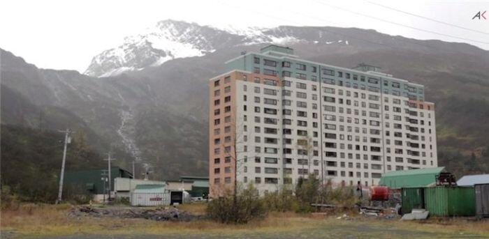 Уиттиер - город это на Аляске, население которого 208 человек, а единственное, что есть на его территории - это одна многоэтажка. В этой постройке живут все без исключения жители города, так же в нём есть магазин, церковь и прачечная. История города уникальна и тянет на целый сериал. Ранее здесь была одноименная военная база, на которой находились небольшие корабли и дизельные подводные лодки. В 1964 году недалеко от берега случилось землятресение, которое спровоцировало цунами, разрушившее военную базу. Военные были переведены в менее сейсмоопасную зону, а гражданское население базы осталось. Жители отремонтировали одно здание, которое раньше было казармой и поселились в нём. В основном жители, которые не заняты в обслуживании единственного строения ездят на работу в соседний городок, который расположен в 105 километрах. Остаются жители в этом месте из-за высоких заплат и многочисленных компенсаций и льгот, бесплатного жилья, а так же ежегодного заработка за счёт туристов, которые в с