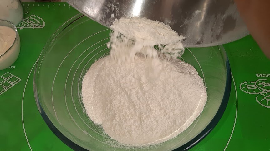 Пшеничную муку просеиваем и высыпаем в большую миску