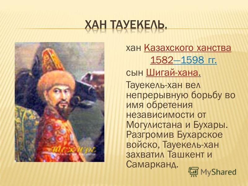 Наиболее значимые победы и расширение территории Казахского ханства вглубь Маверанахра приходится на период правления хана Тауекеля. Именно этот хитроумный правитель, сначала бывший вассалом Шейбанидов смог воспользоваться в пользу казахов междоусобицами в среде среднеазиатских казак-узбеков.