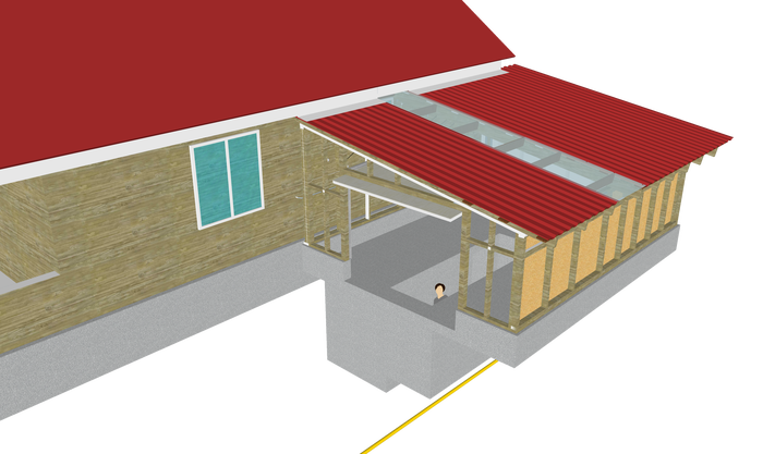 1. Как склад, чтобы разгрузить от стройматериалов и инструментов второй этаж, и начать отделку спальни для ребенка. 2. Я сам ремонтирую пепелац и очень удобно иметь гараж в 2 шагах от дома, а не в городе в 20 км. 3. Мы насадили плодовых деревьев и скоро будет нужен подвал чтоб складировать банки. 4. Мастерская чтобы пилить мебель и прочие полки для дома. Итак первое с чего я начал, сделал 3д модель в скетчупе, перед каждым этапом строительства модель переделывалась и уточнялась, например после просмотра фильма Ларри Хона в 3 частях я значительно переделал каркас в модели, так как понял что сделал много ошибок. Гораздо дешевле исправлять ошибки в 3д модели, чем в натуре, поэтому всем кто собирается что-то строить/ремонитровать очень советую SketchUp. Окончательный вид модели: Итак начнем, нужно выко