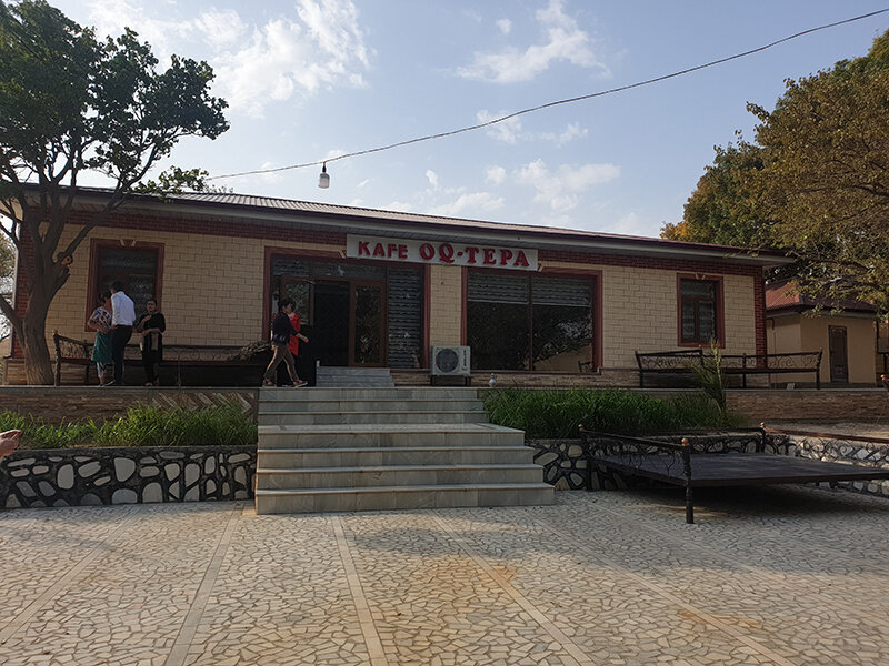 Город встретил очень жаркой погодой, но с ласковым прохладным ветерком. Мы пообедали в гостевом комплексе Oq-tepa. В этот комплекс входит кафе, юртовый лагерь и гостевой дом с комфортными условиями проживания.