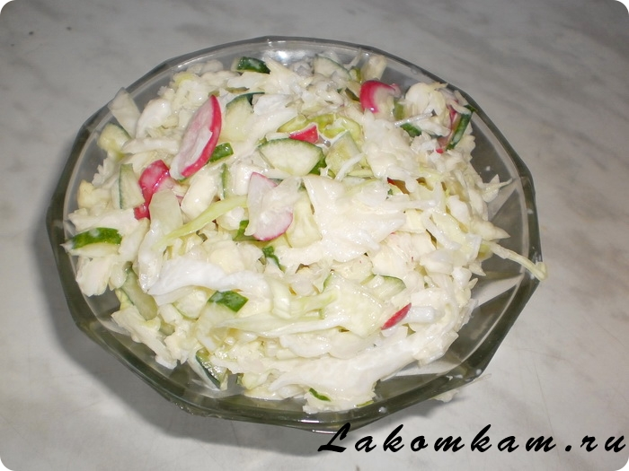Соединяем в глубокой миске: капусту, огурцы, редис