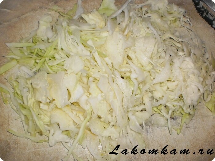 Приготовление салата из белокочанной капусты с редиской. Капусту тонко шинкуем, перетираем с солью руками до получения сока.