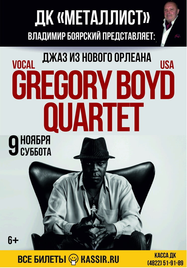 Впервые в Твери, 9 ноября 2019 года в ДК «МЕТАЛЛИСТ», у слушателей появится уникальная возможность услышать необычную музыку мирового класса от искреннего, харизматичного и талантливого музыканта родом из Нового Орлеана- Gregory Boyd(Грегори Бойда). Грегори Бойд — американский барабанщик и вокалист, родом из Нового Орлеана. Его голос покоряет зрителя с первой ноты харизмой Кэба Кэлоувея, душевностью Эла Грина и музыкальностью Джимми Хендрикса. Он исполняет авторские хиты, написанные в лучших традициях афро-американского джаза, фанка, блюза и соула и «добрую старую» классику американского джаза, он -меняет манеру пения несколько раз за композицию, он-даёт ощущение свободной импровизации, он-общается со зрителями и приглашает каждого из них стать соавтором его музыки и пропеть душевные песни всем залом, он-это виртуозная вокальная техника и необъятная харизма-все это Грегори Бойд. В составе квартета Грегори Бойда: Vladimir Nesterenko(Владимир Нестеренко)- клавиши; Ark Ovrutski(Арк Овр