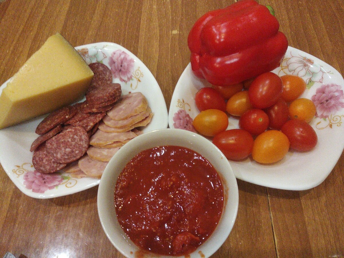 На праздничный ужин, который был у нас в семье, мы решили приготовить пиццу сами своими руками, а не заказывать черещ интернет у известных производителей. Для теста Вам понадобиться: Мука 200-250 г Вода 125 мл Дрожжи живые 4 г Соль 10 г Масло растительное или оливковое 30 г В воду добавляем дрожжи, соль и масло. Все тщательно перемешиваем и добавляем муку, только не всю, а оставляем немного для обсыпки. Присыпаем муку на стол и начинаем замешивать. Формируем в шарик и укладываем в посуду, накрываем полотенцем. Оставляем на 1 час. Через час разминаем еще раз тесто и оставляем еще на 3 часа. Мы делали двойные пропорции, так как у нас было две пиццы. Далее понадобятся следующие продукты: Томаты собственном соку Помидоры Перец сладкий Колбаса двух видов Сыр пармезан Сыр моцарелла Оливки и маслины Никакого майонеза и кетчупа мы не использовали и получилось очень вкусно. В настоящую итальянскую пиццу не добавляют эти ингредиенты. Как только подошло тесто мы раскатываем или разминаем в нужн