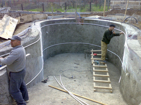 Бассейн под открытом небом это настоящая мечта для многих жителей крупных городов, которые постоянно дышат смогом и пылью мегаполисов. Размер и форма бассейна обычно определяются пожеланиями заказчика и размером самого участка. Ценное качество такого бассейна конструкции – его долговечность, которая напрямую зависит от используемых материалов. При этом не существует никаких ограничений на аксессуары и аттракционы внутри сооружения. Конструкция бетонного бассейна может быть разнообразной, но самым наилучшим считается вариант, при котором опоры устанавливаются на той же плите фундамента, что и дом. При этом техническое оборудование и коммуникации будут располагаться в одном месте, в так называемом обходном пространстве, что существенно облегчит уход за всей конструкцией. Если же расположить чашу бассейна ниже уровнем, чем фундамент дома и в качестве засыпки взять грунт из ямы, то такой бассейн не будет служить долго. Причина состоит в том, что грунт, в отличие от песка, может проседать п