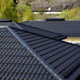 Металлочерепица – это стальные листы с волнообразным профилем, внешне имитирующие натуральную черепицу. Обратная сторона обработана защитным лаком, лицевая сторона - полимерной пленкой. Ориентировочный срок службы – 50 лет, гарантия – 10-15. Допустимый уклон крыши – от 12 градусов.