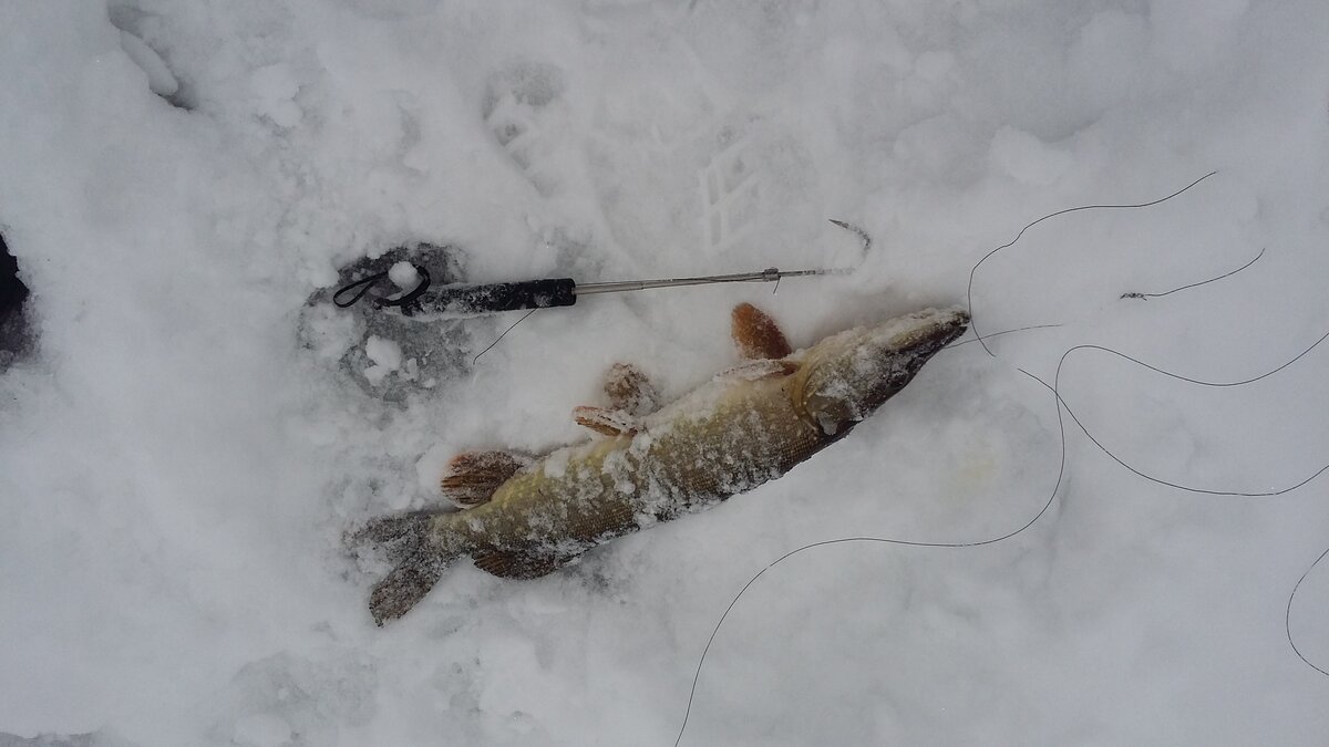 Недолгая борьба увенчалась успехом и мы вытащили щуку на лёд. Пожали друг другу руки и разговорились. Наблюдая, как мой новый знакомый трясущимися ещё от волнения руками цеплял живца, я увидел, что он отмотал от рогатульки всего метра полтора и стал опускать снасть в лунку.