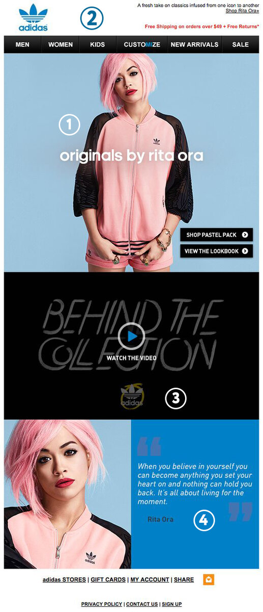 2) Хедер письма выполнен стандартно - слева лого, справа подчеркнутым текстом выделяется “Shop Rita Ora”. Ярким красным цветом выделена Бесплатная доставка, если сумма заказа больше 49 $. Сразу показана выгода.
