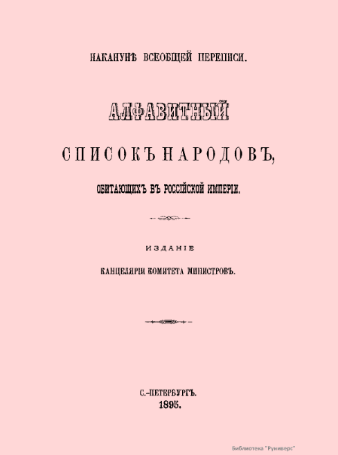 В ХХ век Российская империя вступила, занимая второе, после Британской империи, место по территории — 19 миллионов квадратных вёрст, или 21,6 миллионов квадратных километров. На этой территории проживали 133 миллиона человек — третье место после Китая и той же Британской империи (в её состав тогда входила и Индия). Эти сведения взяты из предисловия к брошюре «Алфавитный список народов, обитающих в Российской империи». Этот официальный документ был напечатан в Санкт-Петербурге как пособие для переписчиков, участников предстоящей 1897 году Всеобщей переписи населения. Этот любопытный документ может представлять несомненный интерес для всех, кто интересуется историей России. В нём даны подробные описания 140 народов (от Абугачей до Якутов), проживавших в то время на территории империи. С указанием численности, территории проживания, рода занятий, языка, вероисповедания, особенностей быта и обычаев. Отдельные сведения сильно отличаются от тех представлений, которые на сегодня сложилис