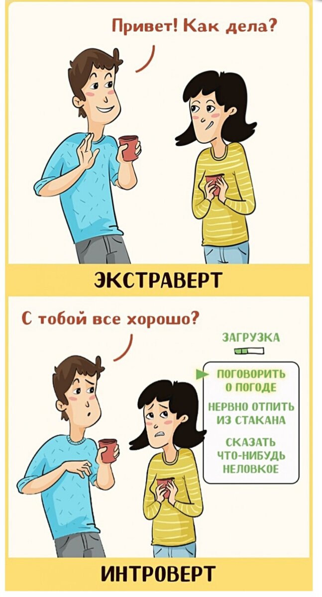 - Плюсы - открыты в общении, легко сходятся с людьми, вписываются в коллективы. Интроверту достаточно общения с собой, или очень ограниченным кругом людей.