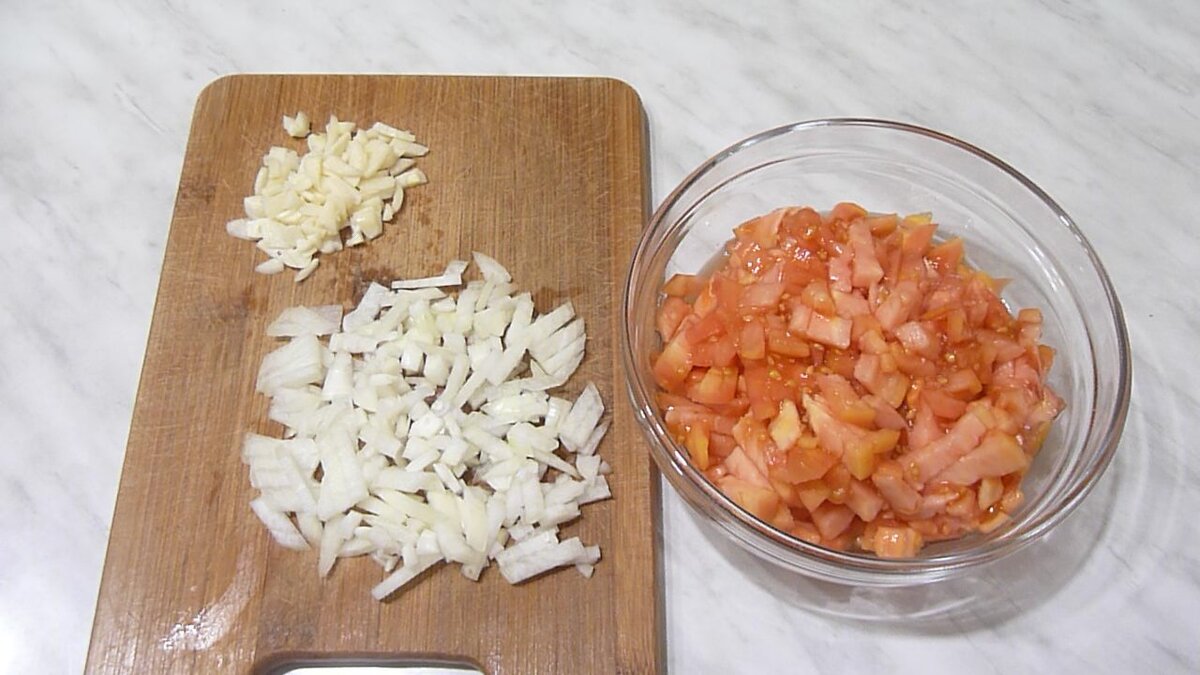 Сегодня я буду готовить соус из помидоров, который можно назвать вариантом итальянского помидорного соуса Маринара. Он хорошо сочетается с макаронами, по-другому — пастой, мясом, рыбой и морепродуктами, пиццей, рисом и другими блюдами. Этот соус можно готовить не только в сезон помидоров, но и заготавливать его на зиму. Основным ингредиентом в рецепте, конечно, являются помидоры. Три крупных плода — это около 800-900 гр. Помидоры я обдаю кипятком или погружают в кипяток на несколько секунд. Снимают кожицу и мелко режу. Дополнительные ингредиенты — лук и чеснок. Можно взять что-то одно. А можно то и другое.