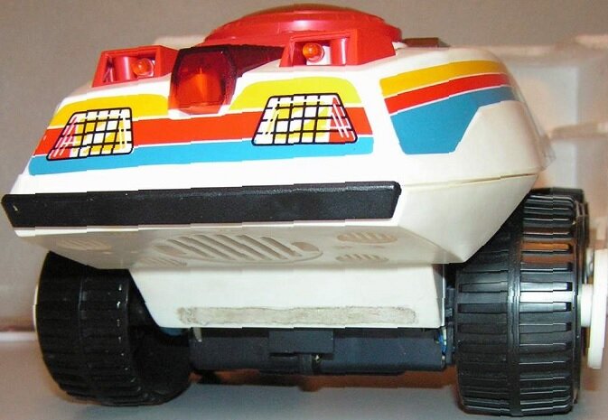 В начале восьмидесятых в СССР появляется невиданная доселе игрушка - программируемый планетоход "Электроника". О ней писали в научных журналах, и помнится даже рекламировали по ТВ, что не сделало её особо распространенной - вещь была дорогой и сложной, хоть и выпускалась разными производителями. Это интересно. Немного инфантильности, завернутой в современную технологическую обертку. Забавный взгляд на танки! Сама игрушка являлась копией футуристического танка "Big Track", выпущенного американской компанией "Milton Bradley" в 1979 году. При внешней идентичности были у советского аналога и конструктивные отличия. Например, датчиками пройденного пути стали герконы (герметизированные контакты, замыкающиеся под действием магнитного поля), появился бампер с микровыключателем, отключавшим питание при столкновением с препятствием - для экономии энергии батареек. В остальном внешний вид повторял оригинал. Многих советских детей мучал вопрос - для чего на корпусе отверстие, закрывающеес