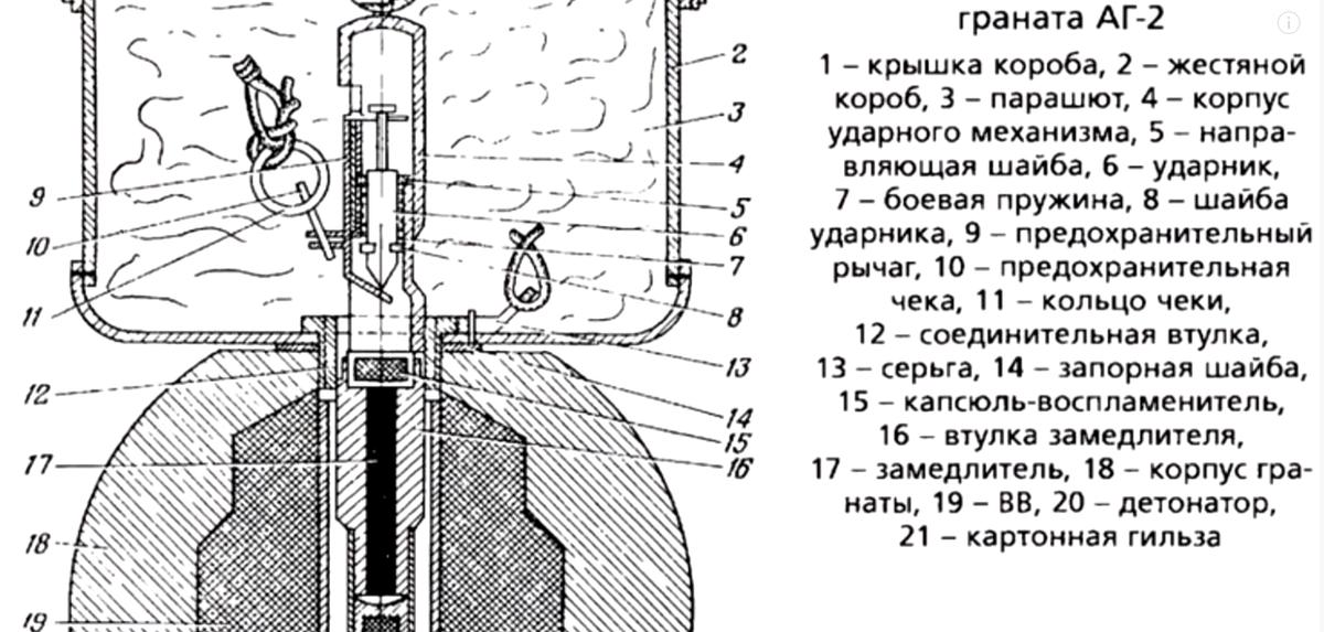 Гранату взяли обычную пехотную, но с доработки для авиационных условий. Время срабатывания сократили с 6 секунд до 3. Также убрали не нужный предохранитель.