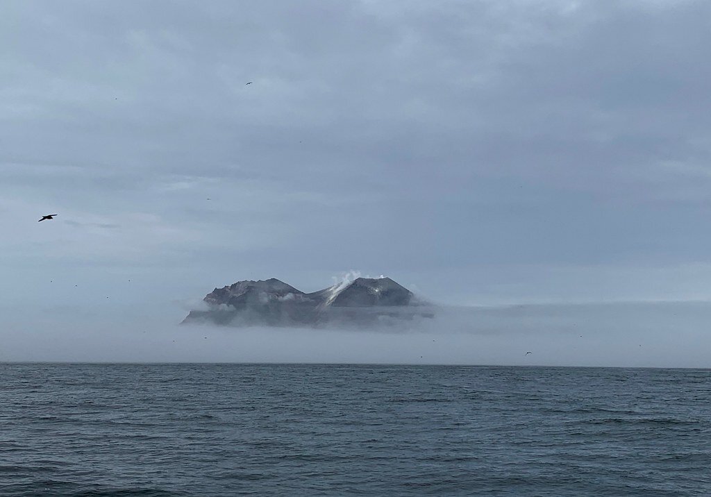 Вулкан Чёрного - второй действующий вулкан на острове Чирпой решил показаться, чуть прикрывшись для красоты занавесочкой лёгкой дымки.
