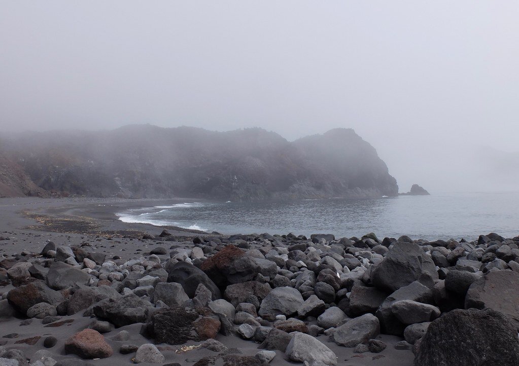 Мы высадились на совершенно пустынный чёрный пляж, который окружали вулканические руины.