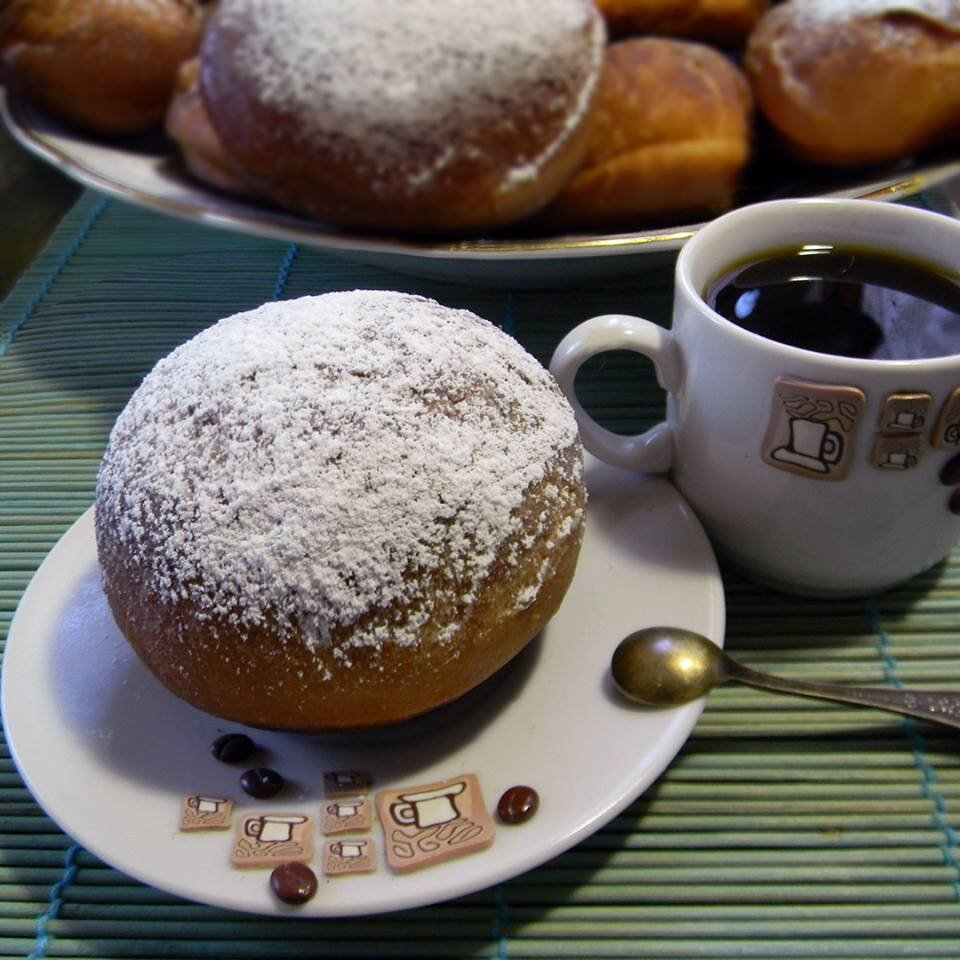 Внутри он получается полым, так что можно придумать любое вкусное наполнение. Наполнив берлинеры джемом, посыпать сверху сахарной пудрой. Всё! Мучайтесь.