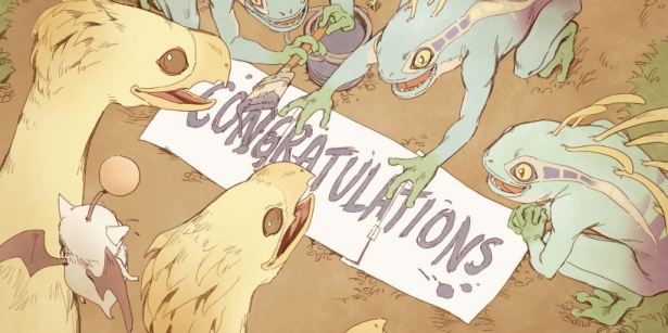 Натаниэль передал разработчикам открытку от своих бывших коллег, которой они поздравили тех с недавним успешным запуском дополнения Shadowbringers – на ней можно видеть, как несколько мурлоков старательно выводят надпись "Поздравляем" для маскотов FFIV – чокобо. Открытка досталась директору игры Наоки Ёсида, и тот даже сделал с ней фото. А композитору Масаёси Сокену лично был вручен постер с автографами создателей Overwatch и диск с саундтреком коллекционного издания игры.