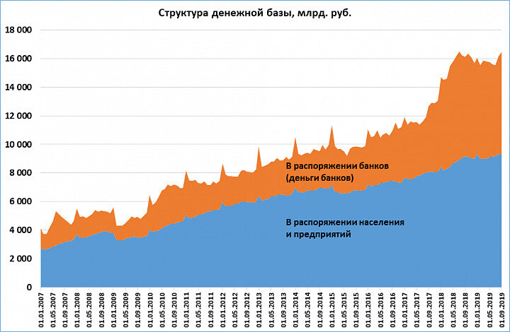 Если говорить просто, то денежная база является своеобразным фундаментом для создания денежной массы (см. первые семь минут видео об этом здесь). Если же вдаваться в детали, то таким фундаментом является не вся денежная база, а та её часть, которая находится в распоряжении банковской системы. Денежная база в распоряжении населения и предприятий – это наличные вне банковской системы (грубо: в кошельках граждан и кассах предприятий). Денежная база в распоряжении банков (далее – деньги банков) – это наличные в кассах банков и все обязательства Центробанка перед банками (грубо: всё что ЦБ «должен» банкам: их депозиты в ЦБ, корсчета там же, облигации Банка России, купленные банками и т.п.). Обзор показателя «деньги банков» Деньги банков на 1 сентября вновь превысили отметку 7 трлн. рублей. Впервые деньги банков поднимались выше этой отметки в апреле 2018 года. То есть сейчас взята высота, которую уже брали больше года назад. Уже это говорит, что показатель в последнее время практически не