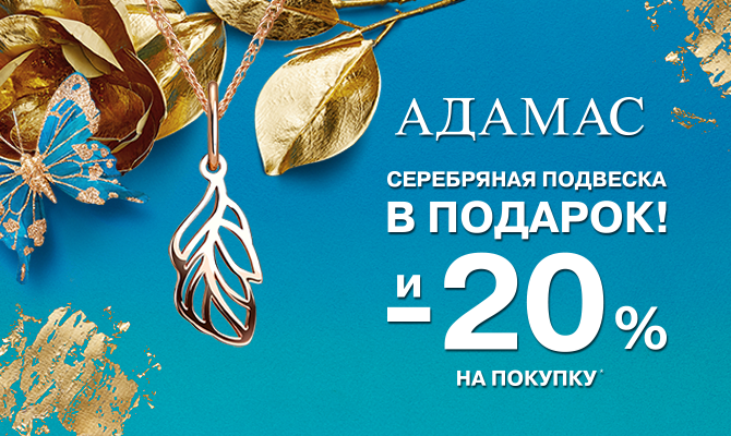 В сети фирменных магазинов Адамас до 31.10 по специальному промо-коду можно получить на выбор серебряную подвеску или скидку 20% на покупку.