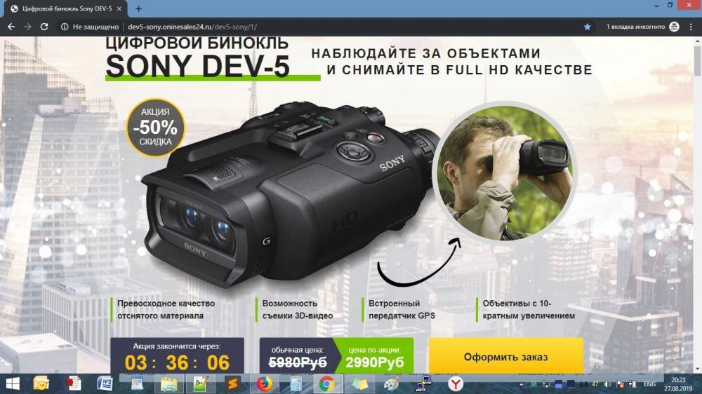 Встречаем новый развод на старый товар: «Цифровой бинокль SONY DEV-5 за 2990 рублей» по скидке 50% Как пишут на своих сайтах мошенники: Sony DEV-5 – это одно из первых устройств в своем роде, представляющее собой более чем удачный симбиоз обыкновенного цифрового бинокля с цифровой HD-видеокамерой. SONY DEV-5 больше не выпускуют У компании sony есть линейка из цифровых биноклей с функцией записи - Это DEV-5, DEV-3, DEV-50v Но это все модели 2011-2013 годов. Сейчас они не выпускаются. Вы можете зайти на официальный сайт магазина SONY и никаких DEV-5 там не найдете. https://store.sony.ru/search/?kv4=dev-5&f4=1 Эти модели в свое время стоили до 40000 руб, а сейчас они существуют только как БУ. Как обманывают продавая SONY DEV-5 за 2990 руб? Товар высылается наложенным платежом без описи вложения и вы не можете его проверить до оплаты и потом вернуть свои деньги. В посылке вы получите простой дешевый бинокль или какую-нибудь дешевую, китайскую безделушку. Друзья не ведитесь - Это РАЗВОД!!!