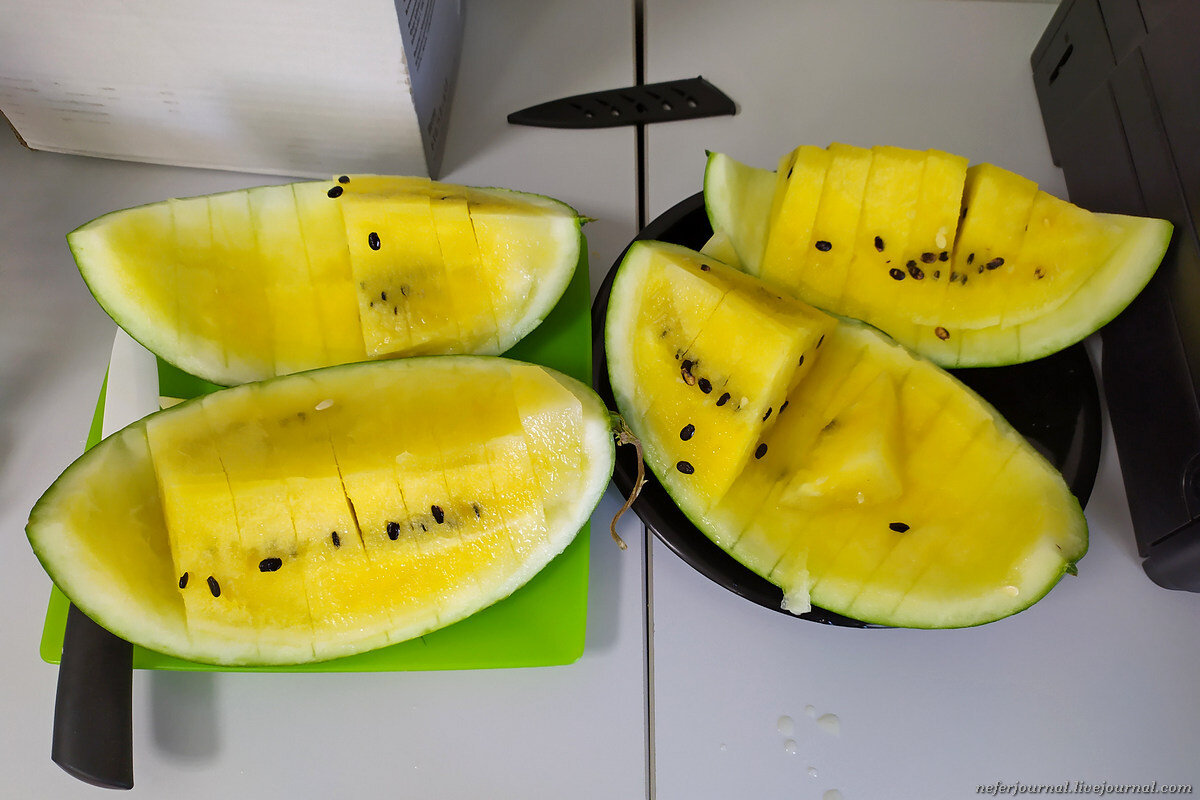 Сегодня две повестки дня: длинные арбузы и вот. Этим летом я впервые в жизни попробовала желтый арбуз! Даже засняла для истории :)