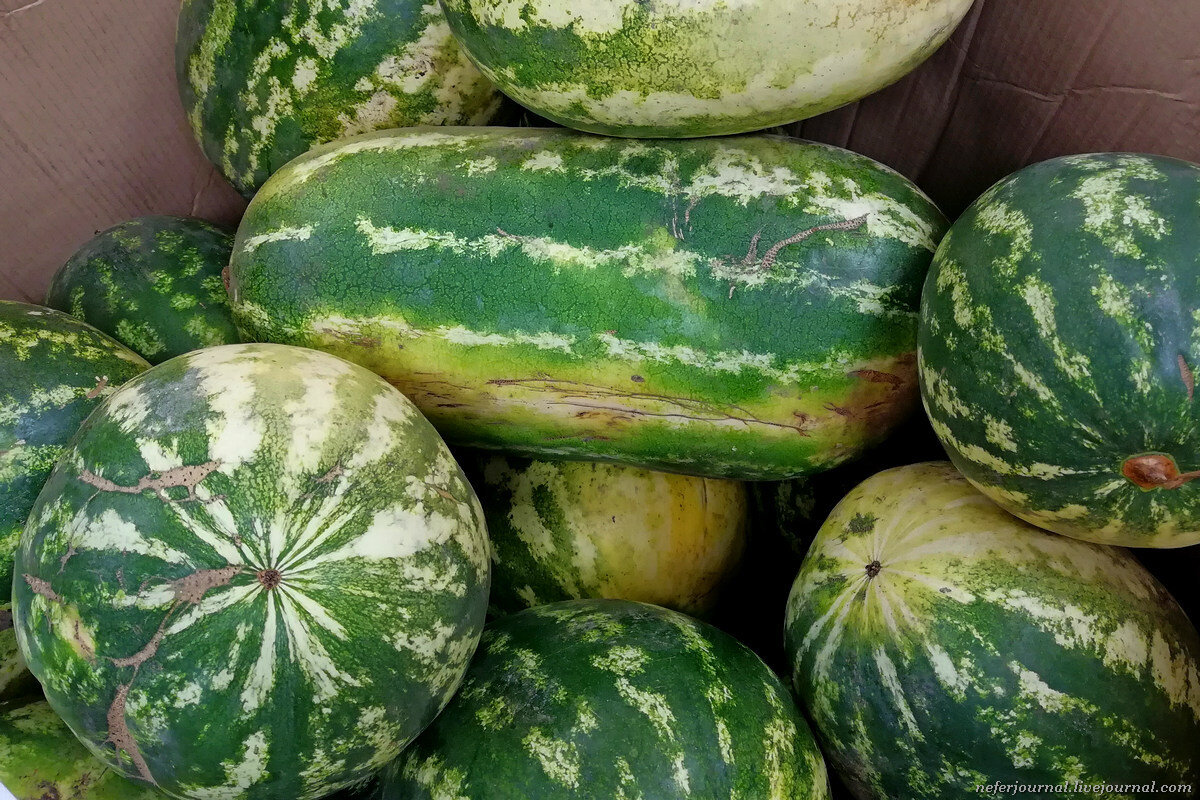 Спросила у Яндекса, что за мутант такой. Считается, что наши длинные арбузы являются родственниками американского сорта "Чарльстон Грей". Они отличаются повышенной сахаристостью и часто вырастают огромными, вес доходит до 20 кг. Однако длинным арбузам необходимо много тепла и солнца, а также подходящая почва. Если какое-то из условий не соблюдается, арбуз может потерять сахаристость и стать водянистым. Вон оно как.