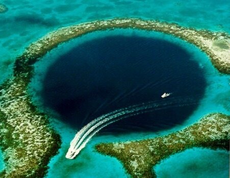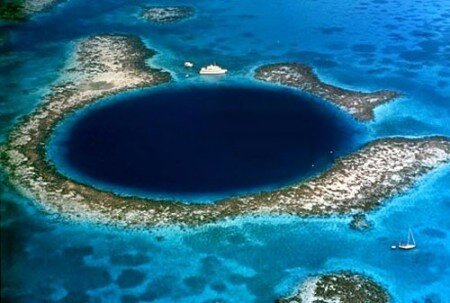 Крупная кастровая воронка, расположенная в центре Лайтхаус-Рифа, атолла в составе Белизского барьерного рифа. Диаметр этого природного чуда 305 метров, а в глубину она уходит на 120 метров. Голубая дыра ежегодно привлекает огромное количество дайверов со всего света.