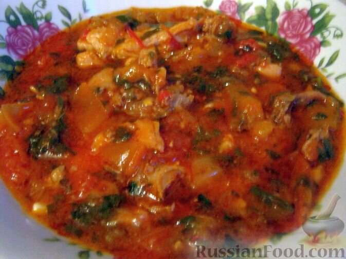 Чахохбили-это тушёная курица с овощами ,известное блюдо грузинской кухни.Внимание!Чахохбили - это не суп, а второе блюдо.