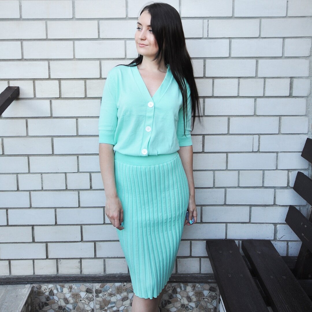 Хочу показать вам очень красивый костюм на лето, осень, весну. Лёгкий и удобный. Отличный вариант для работы в офисе либо для вечерней прогулки. А цвет костюма просто потрясающий! Очень освежающий, мятный. Но у продавца в наличии есть и другие цвета. Костюм состоит из юбки, садящейся по фигуре и свободной кофты на пуговицах.
