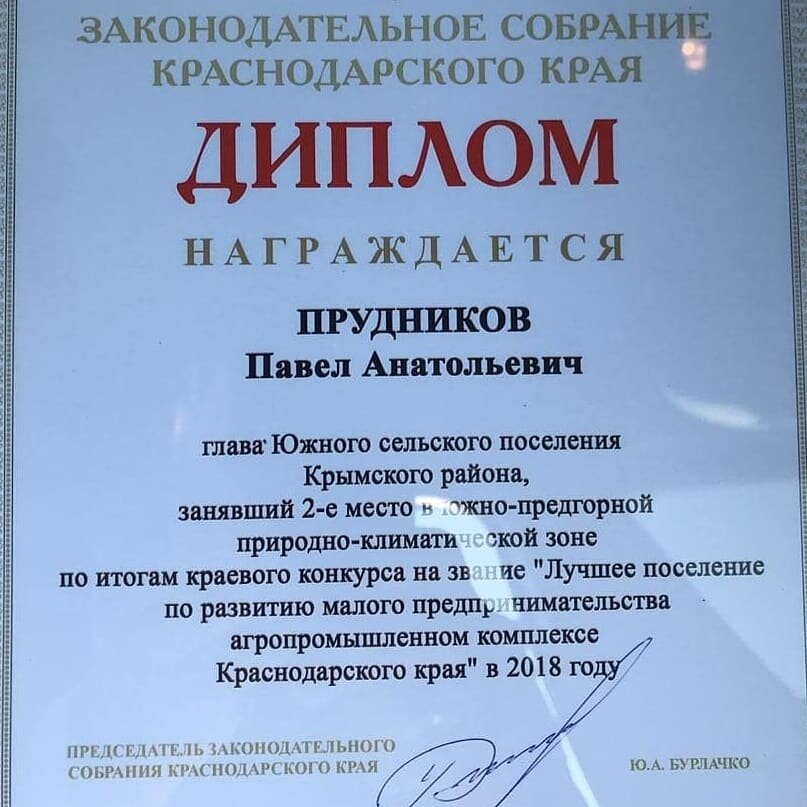 Сегодня в рамках агропромышленной ярмарки "Кубанская ярмарка" в городе Краснодаре состоялось торжественное награждение победителей конкурса по развитию малого предпринимательства в АПК по итогам 2018 года.⠀ ⠀ Первый зампредседателя аграрного комитета ЗСК Сергей Орленко, выполняя поручение спикера кубанского парламента Юрия Бурлачко, вручил сегодня главам сельских поселений дипломы Законодательного Собрания, в том числе и главе Южного сельского поселения Павлу Прудникову. Южное сельское поселение заняло 2 место в южно-предгорной природно-климатической зоне!⠀ ⠀