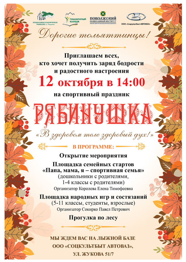 14 октября в 14.00 приглашаем гимназистов, педагогов, родителей, всех тольяттинцев и гостей города на спортивный праздник "Рябинушка".