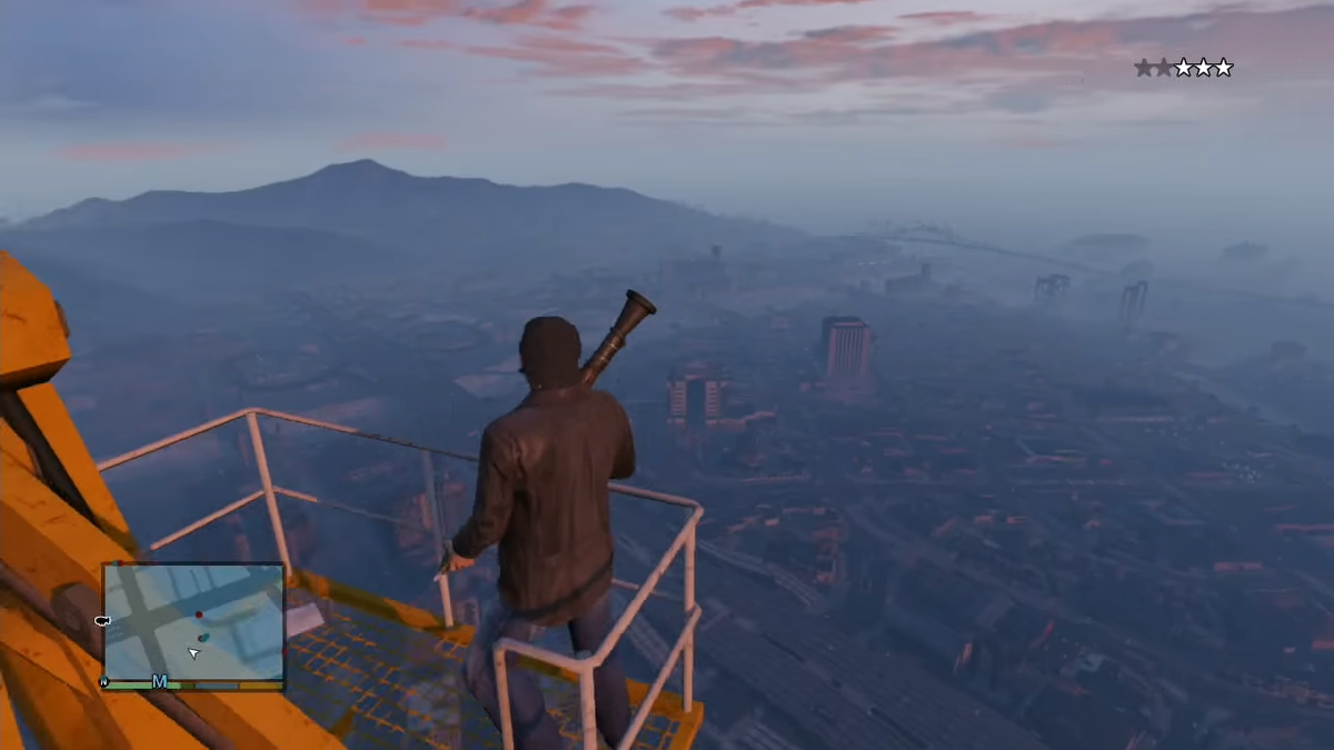 Приветствую вас дорогие любители компьютерных игр. Сегодня хочу поделиться одним местом в компьютерной игре Grand Thaft Auto 5. А именно самое высокое место на которое можно забраться без сторонних средств (вертолётов,кодов и т.д) И это место огромный строящийся небоскрёб в самом центре Лос Сантоса с прикреплённым к нему огромным башенным краном. Именно этот кран нам и потребуется. Найти его очень легко просто посмотрите на небоскрёбы в центре и сразу заметите то что нам надо. Далее отправляемся прямо на стройку. Что бы найти доступ к лестнице на самый верх нам потребуется спуститься в самый низ стройки к основанию крана. Ну а дальше нам предстоит долгий путь наверх. Одно взбирание наверх по лестнице займет займет целых ВНИМАНИЕ 5 минут!!! Это можно проверить в моём видео ниже. Зато оно того стоит! Огромный Лос Сантос с этого места как на ладони! Самолёты,вертолёты и дерижабли летают на уровни ваших глаз. Я долго не думая решил почудить и подбить несколько. Что из этого вышло смотр