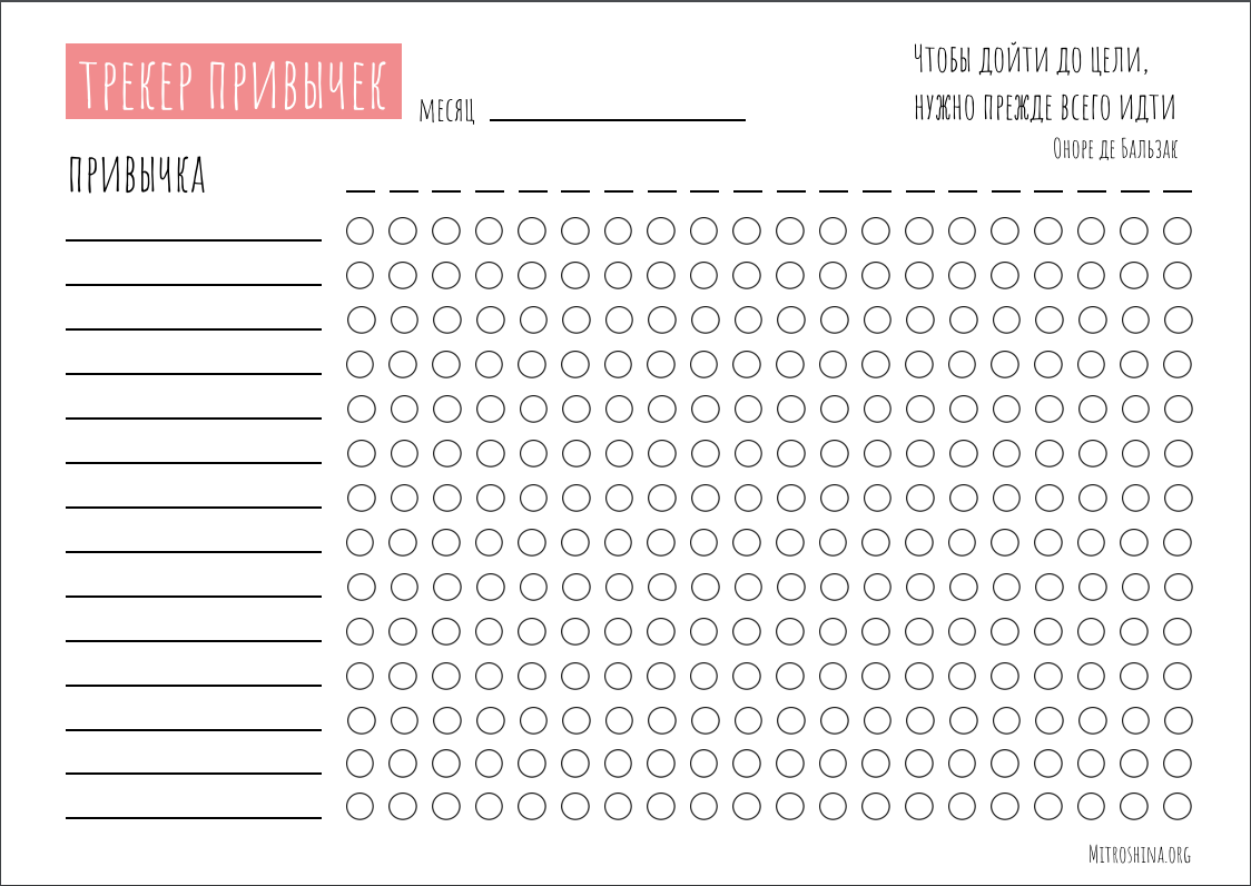 Если Вы хотите приобрести новые привычки и не забывать о них, выполнять каждый день, то вам просто необходим трекер привычек. Он очень просто в применении, в поисковике можно найти наиболее импанирующий вам дизайн и распечатать его. Далее в строчки по вертикали мы прописываем привычки, задачи которые необходимо выполнить в течении дня, а по горизонтали располагаются даты, для вашего удобства. При выполнении какого-то пункта, вы помечаете его. В конце недели, либо месяца Вы анализируете свои результаты, таблица наглядно даёт понять где вы халявили, и где нужно поднажать. У меня, к примеру, такая оплошность есть в тренировке пресса, но я стараюсь исправить этот недостаток. За счет своей простоты и наглядности,эта табличка вырабатывает привычку и всегда служит для вас напоминалкой. Кстати, повесьте его на видное место, чтобы всегда можно было видеть ваши показатели. В дальнейшем можно сравнивать эти таблицы за предыдущий месяц и разбираться в какой период вы были более продуктивны. Поде