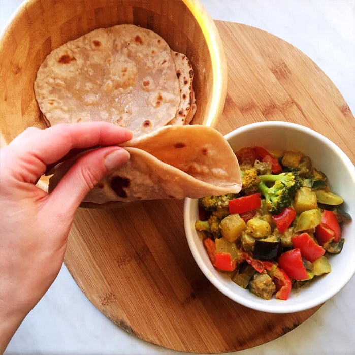 ✔ гхи или оливковое масло Готовим овощи. Моем и режем небольшими кубиками, помидоры можно чуть крупнее. Брокколи разбираем на соцветия. В сковороде растапливаем масло, добавляем в него специи и обжариваем, чтобы они полностью раскрылись. Добавляем овощи, хорошо перемешиваем, вливаем немного воды и тушим до полуготовности под крышкой. В финале добавляем сливки, даём покипеть минутку и отключаем плиту. Оставляем на 10 минут, чтобы овощи напитались соусом. Для чапати: