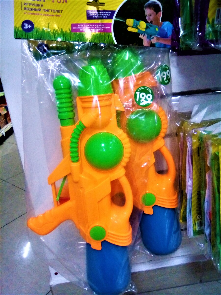 ВОДНЫЙ ПИСТОЛЕТ,цена 199 рублей Хорошая игрушка,и в подарок не стыдно купить.Изготовлен качественно.Съёмный баллон на 0,8 л.,предохранитель предотвратит случайное нажатие на курок,а с помощью помпового насоса получается стрелять на дальние расстояния.Цвета в ассортименте.