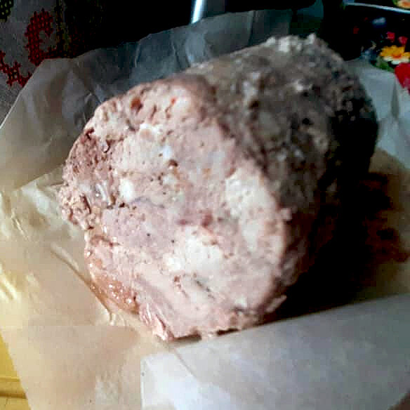 но это, конечно, личный бзик 😉. В подготовленное мясо добавить соль-молотый чёрный перец-сухой желатин-сухие травы-мускатный орех-сушёный молотый чеснок, сырое яйцо (можно и без него). В принципе, неплохо будет добавить мелкие кусочки красного болгарского перца или кружочки оливок, но это при желании. И готовить буду не в ветчиннице, а в пивной банке. Есть у меня специальная ветчинница, но когда не было, я взяла