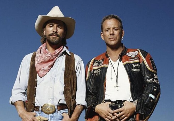 В фильме - ковбой Мальборо (Роберт). Наверняка он знаком с Софией Ротару и у них есть какой-то общий секрет... Они оба как-то по-особенному стареют. Вроде и стареют, а сильно не меняются. Снимается, в меру светится. Помимо своей звёздной роли в "Харли Дэвидсоне..." очень круто сыграл в "Джанго освобождённый". Знаю, что ярких фильмов с ним немало, но вот для меня он навсегда ковбой Мальборо. Дочка его кстати любит когда с ней погорячее и снялась в "50 оттенков серого" в главной роли.